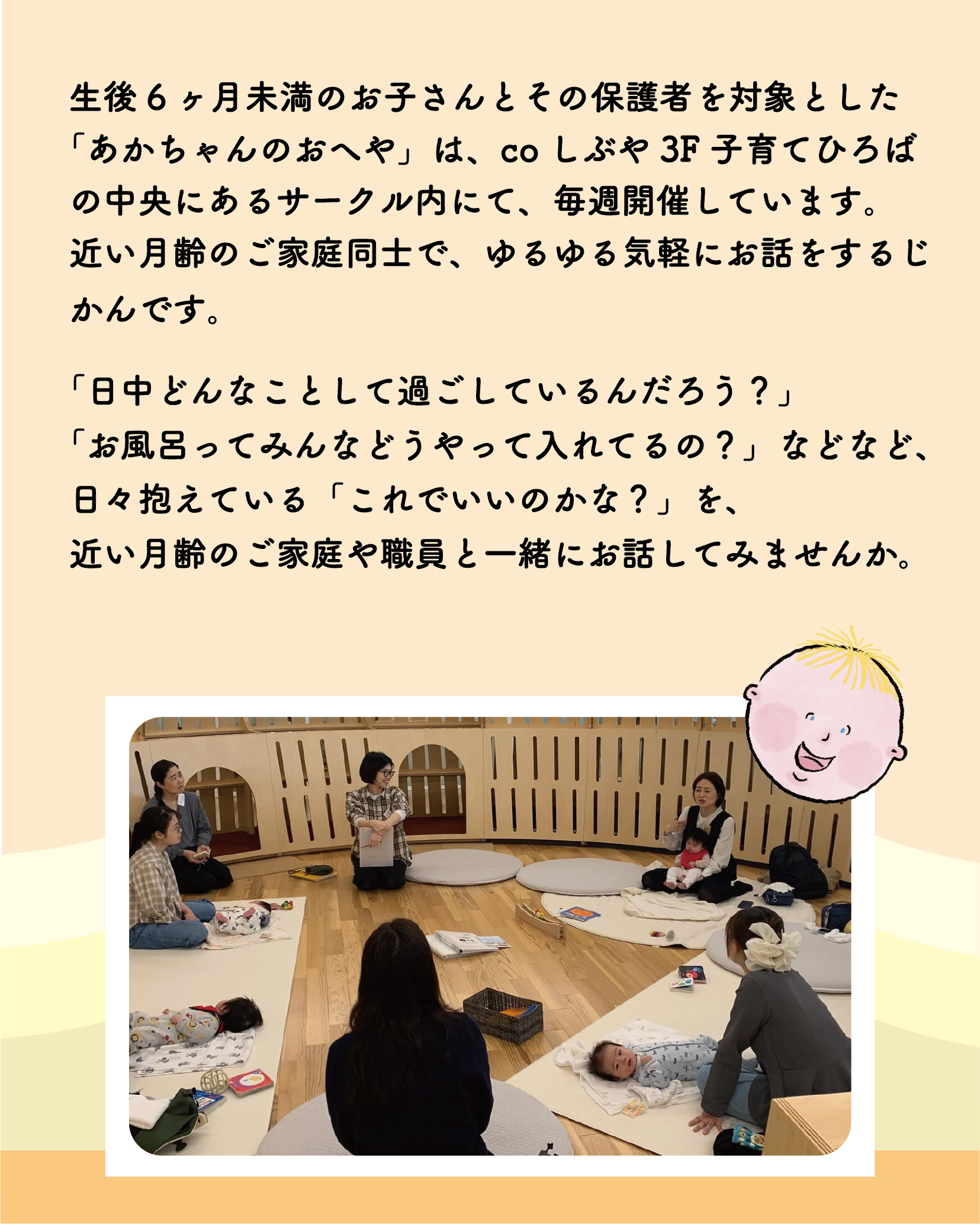 coしぶや3F子育てひろばの中央にあるサークル内にて、毎週開催しています。