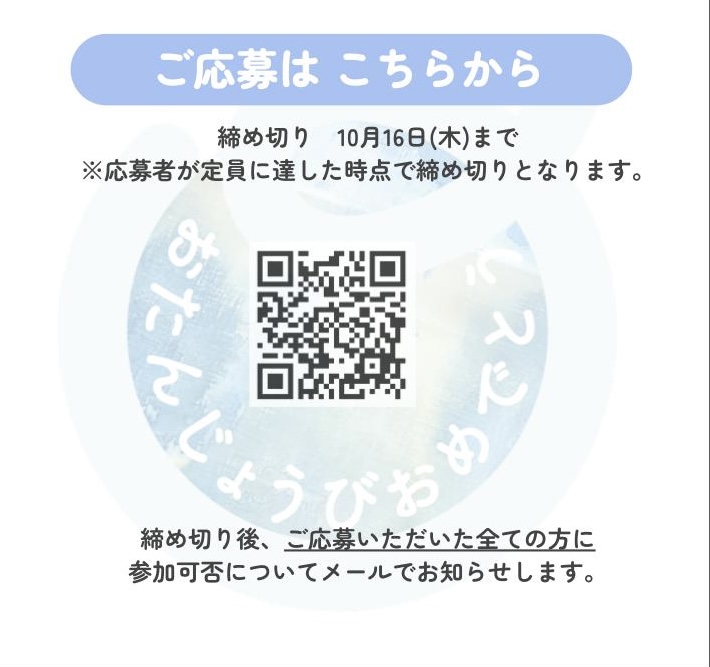 ※締め切り後、ご応募いただいた全ての方に参加可否についてメールでお知らせします。