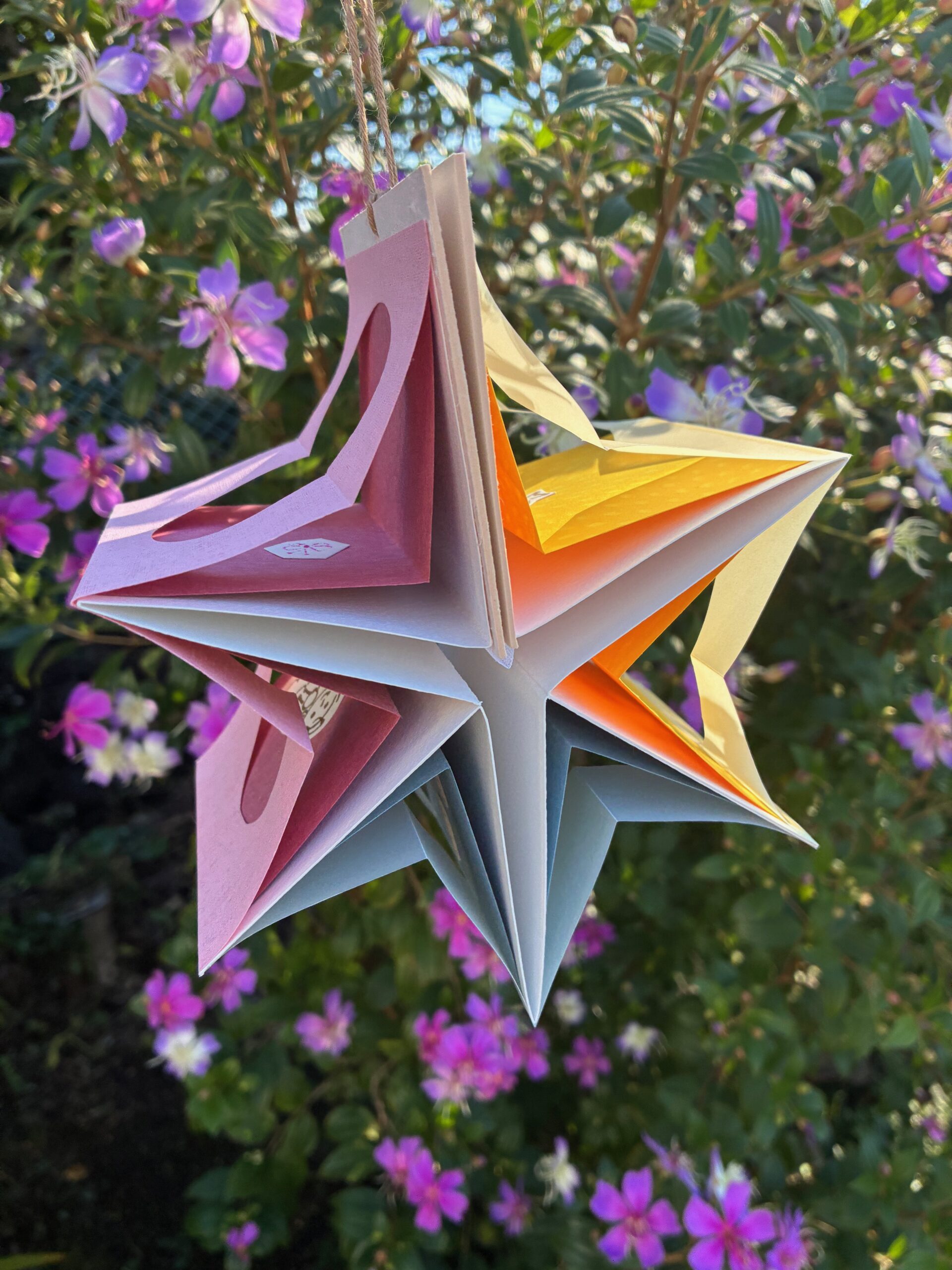 思い出や風景、好きな人や動物など、あなたの「3つの物語」をひとつに綴じてスターブックを作ります。切絵をしたり好きな画材を使ってあなたの手で描きましょう。子どものぐちゃぐちゃっとした線も今しか描けない大切な線。大きめの紙に描いたものを切貼りする方法もありますので、失敗を気にせず表現してください。仕上げは手製本で行います。用意した材料を使いますので、カッターは使用しません。星形のモビールのように飾れます。