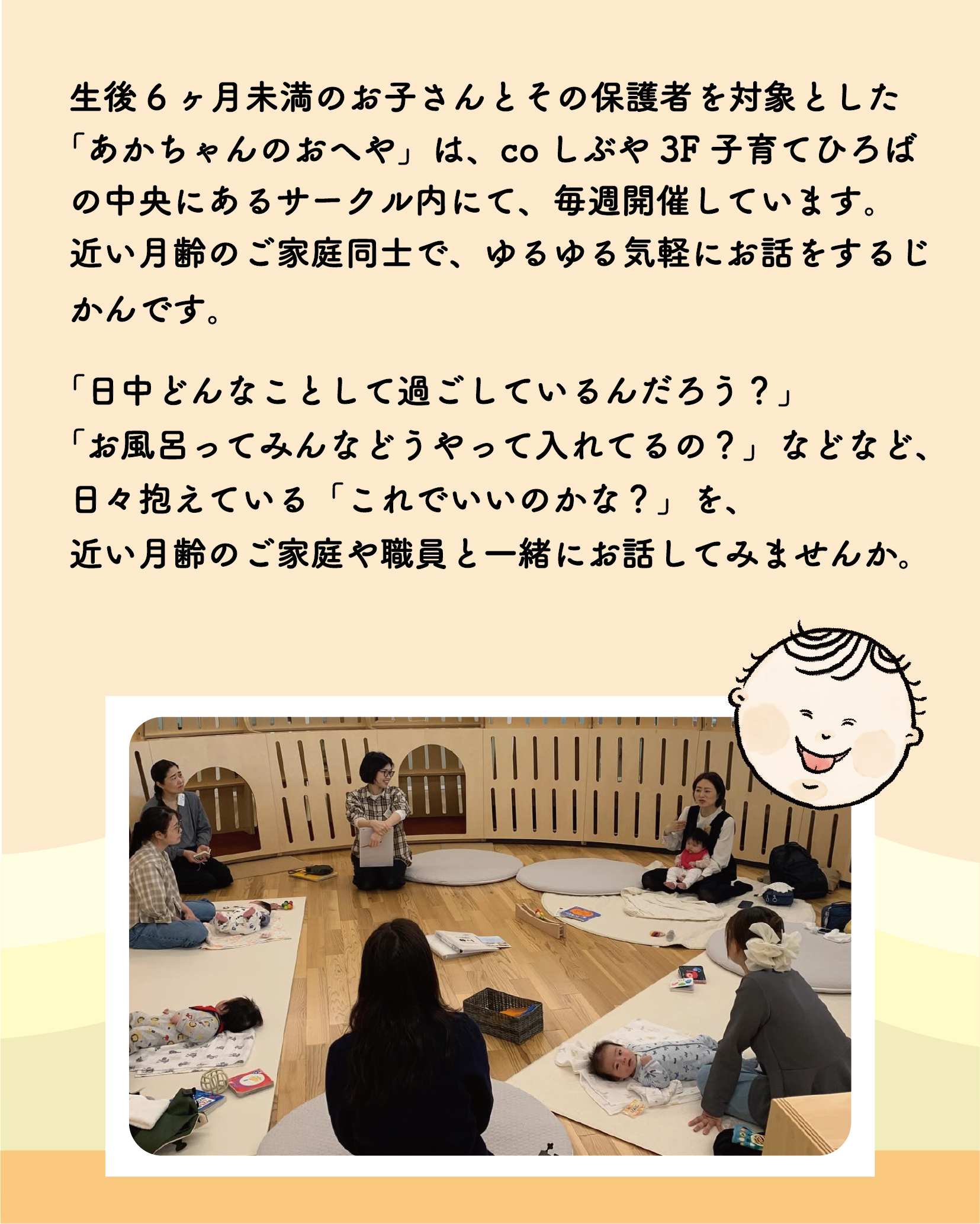 coしぶや3F子育てひろばの中央にあるサークル内にて、毎週開催しています。