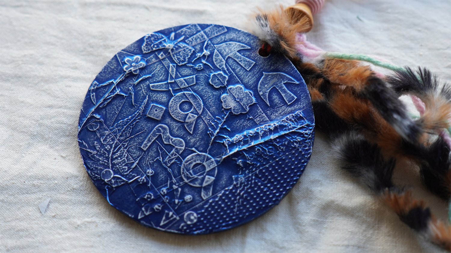 ヒモを通してつけて毛糸やビーズを付けて、ゴージャスな自分だけのメダルネックレスを作ります。