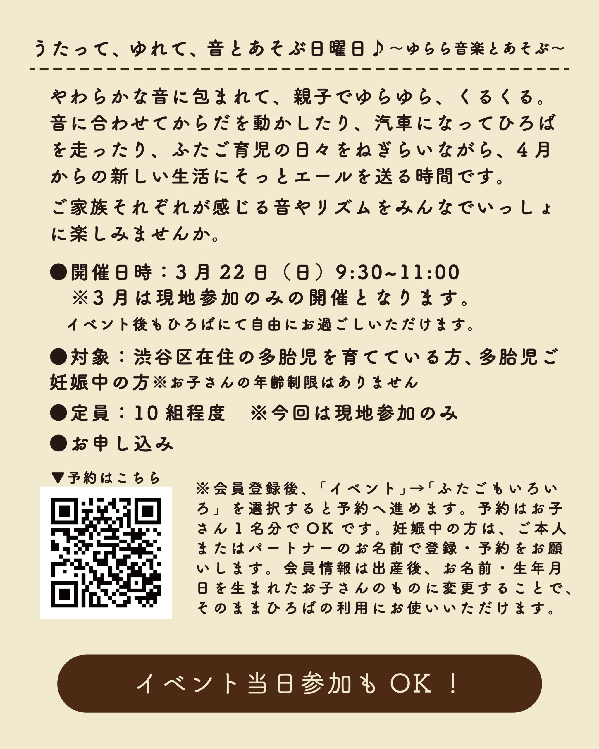 この時間は、渋谷区在住の多胎児妊娠中・育児中のご家庭同士、情報交換をしたり、多胎児家庭ならではの育児についてお話をする交流の時間です。