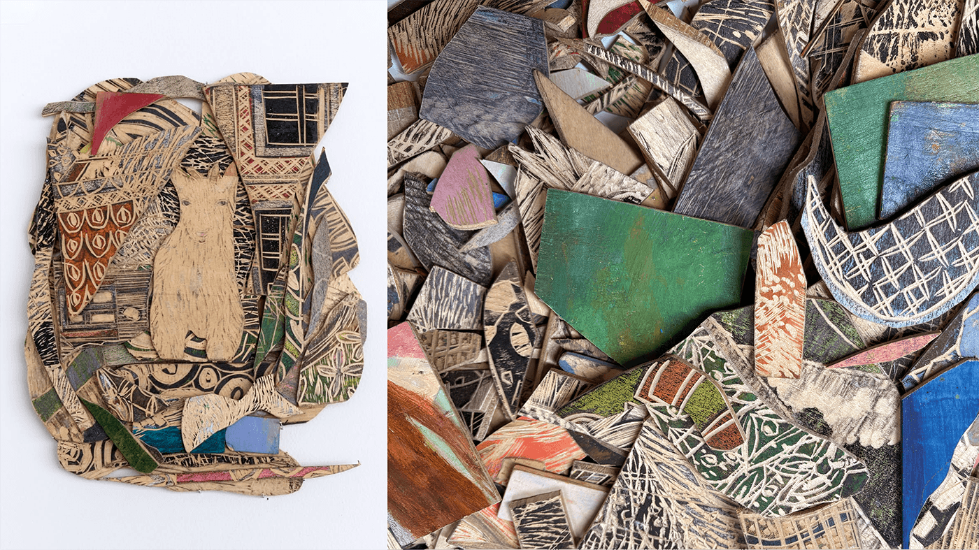 木版画の技法を用いながらも、紙に刷るのではなく、彫り込んだ板に彩色やコラージュをほどこし、平面と立体を行き来する表現を追求。