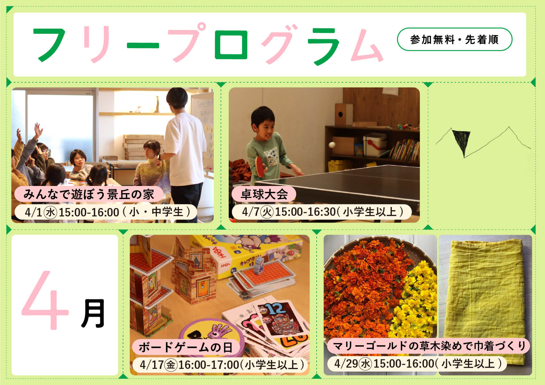 4月は、卓球大会やボードゲームの日、マリーゴールドの草木染め巾着づくりを開催。
