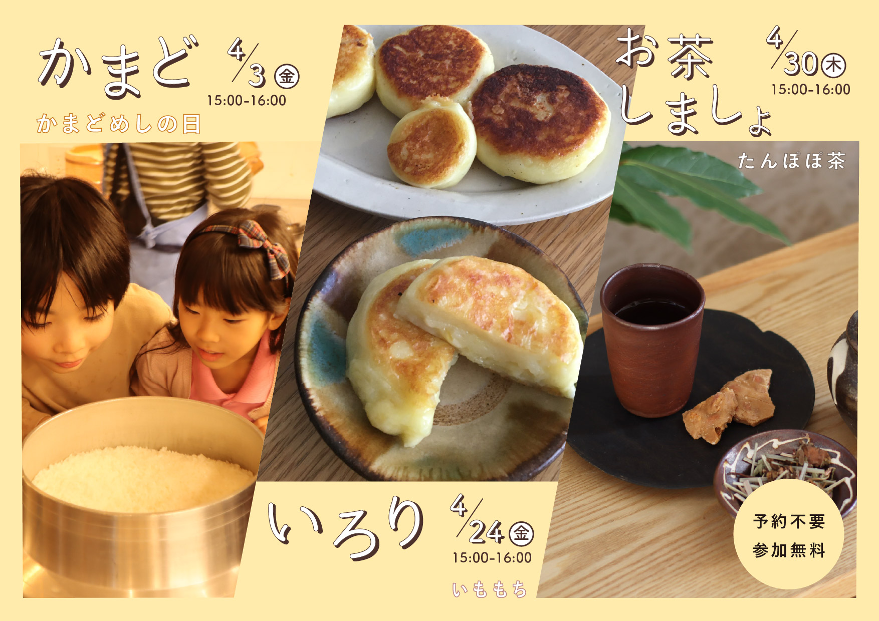 毎月開催している、いろりやかまどを使った景丘ならではのプログラム。