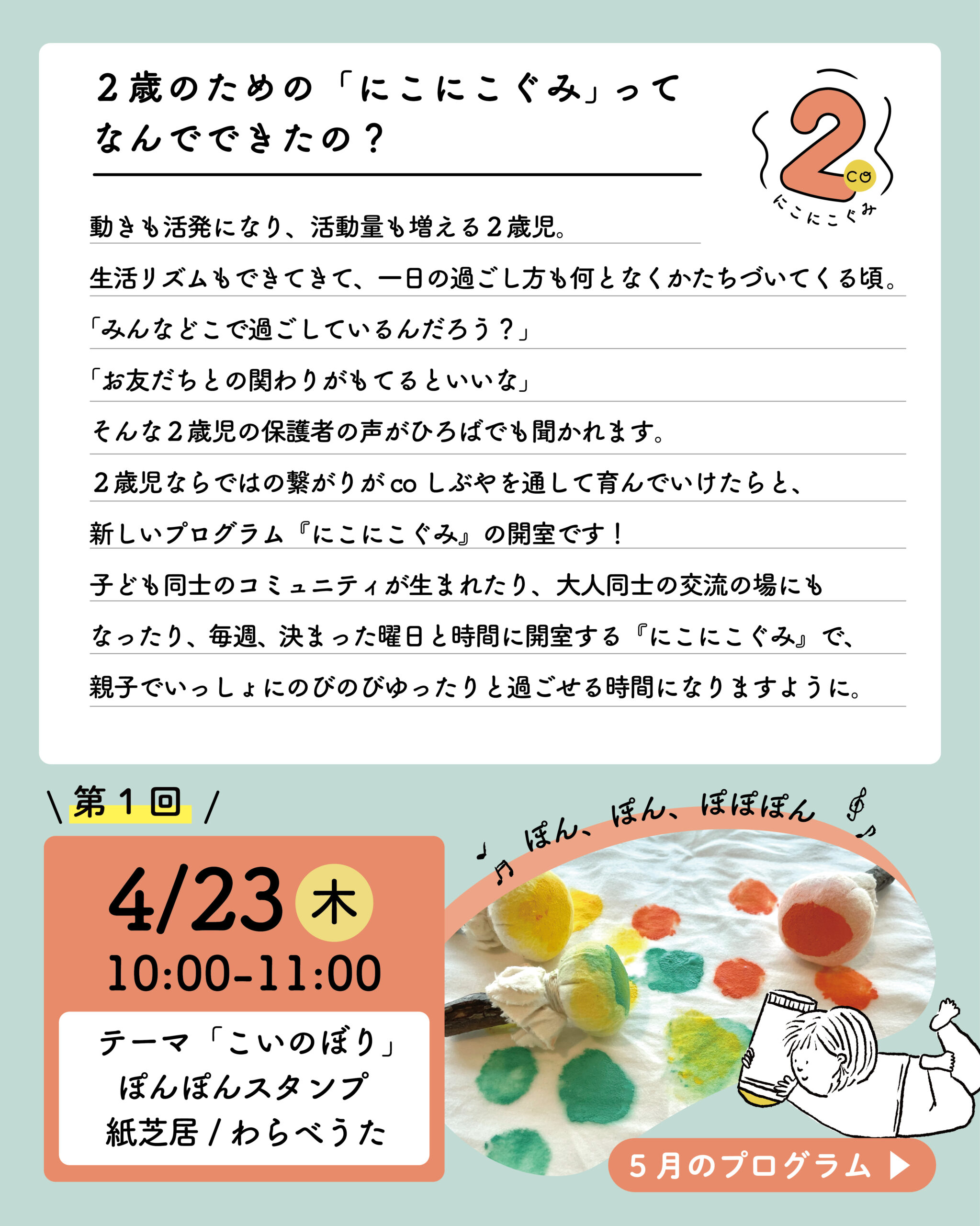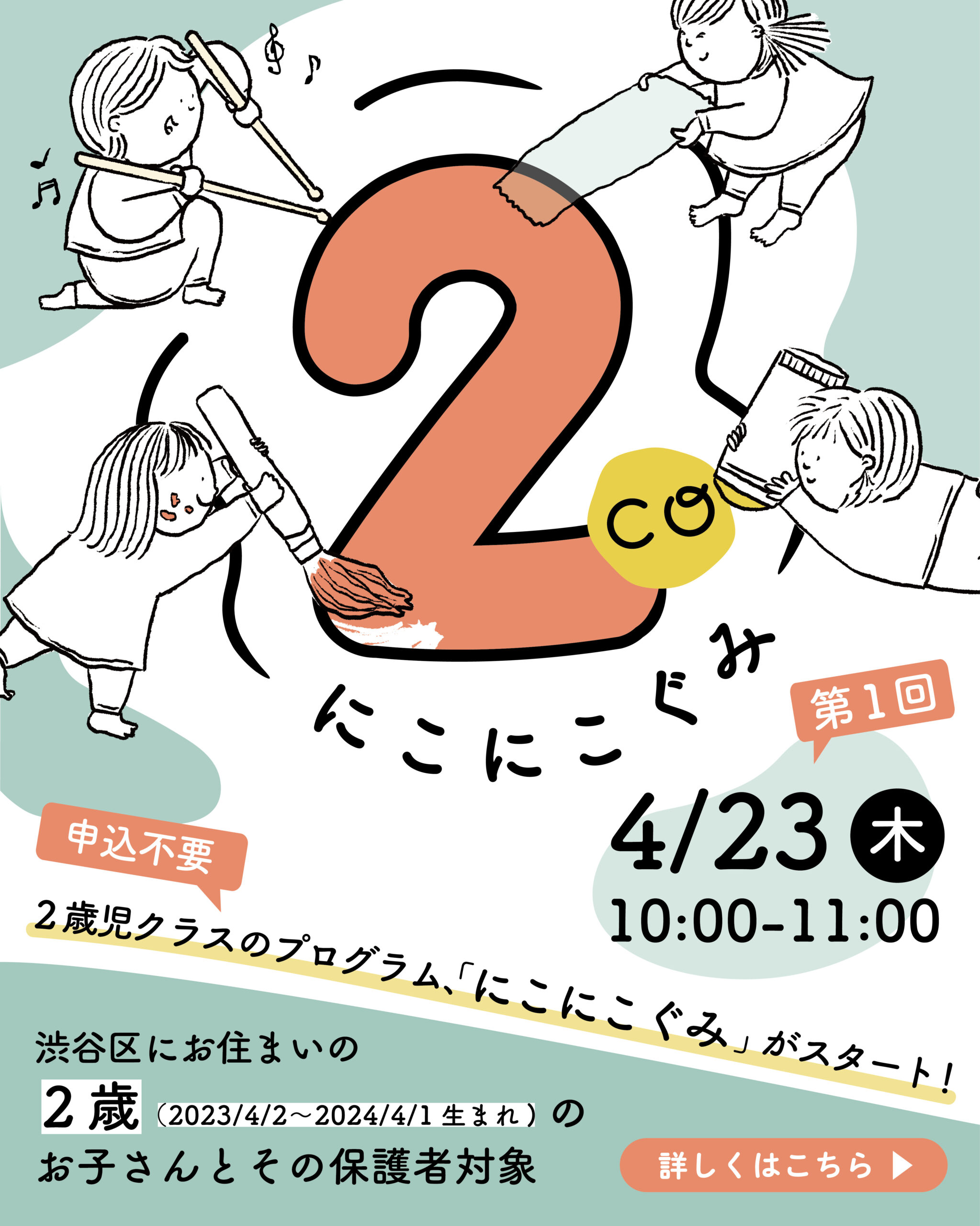 2歳児クラスの「2」と、coしぶやで、親子でいっしょに”にこにこ”(2co2co)あそんで、のびのびゆったりと過ごせる時間になるようにという思いから、このなまえをつけました。
