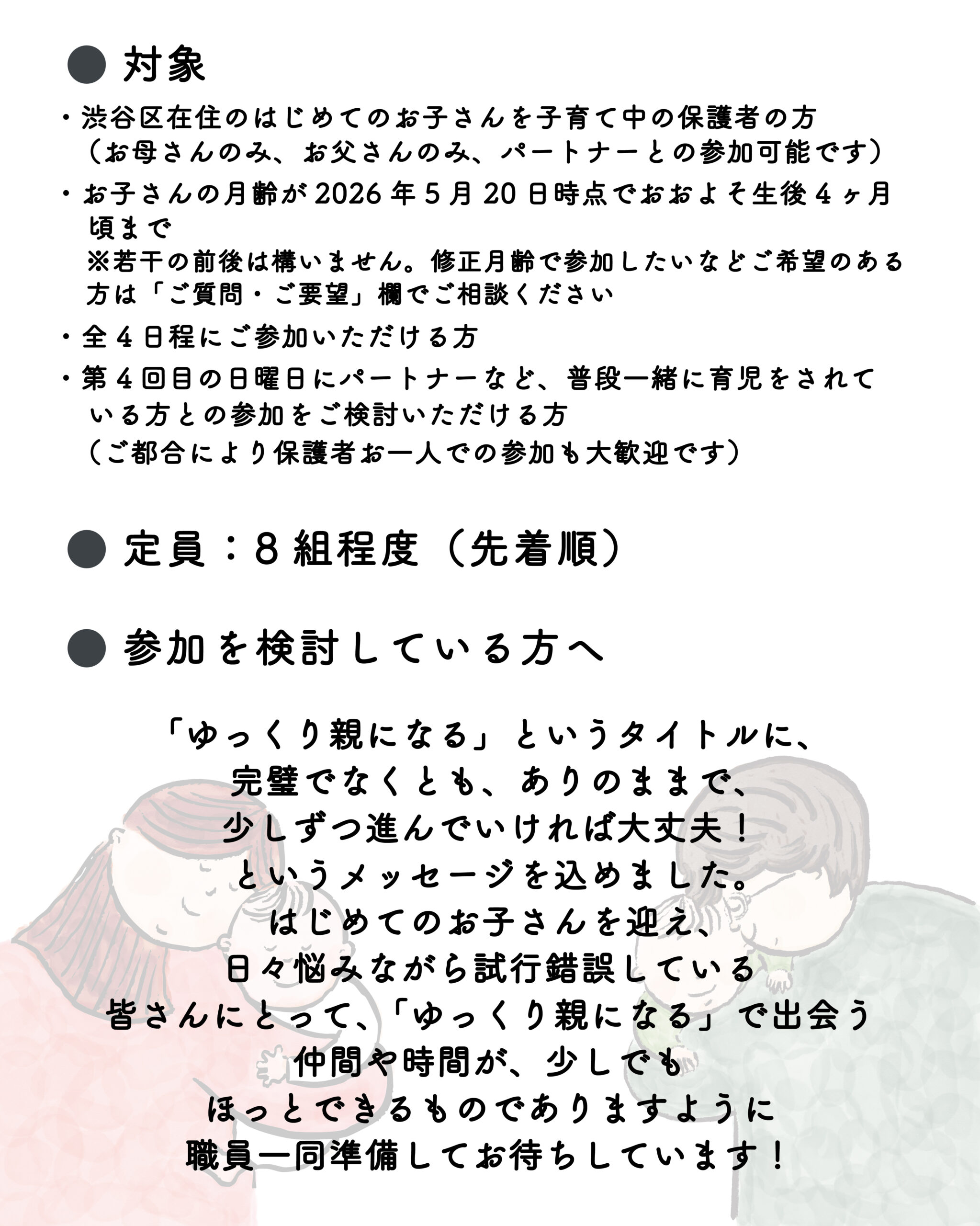 ・渋谷区在住のはじめてのお子さんを子育て中の保護者の方(お母さんのみ、お父さんのみ、パートナーとの参加可能です)